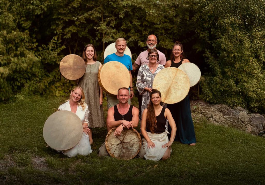 … durch Haltung, Struktur und Tiefe. Teilnehmer beschreiben die Workshops nicht als Kurs, sondern als Erfahrung, die bleibt – als Heimkommen, als Wendepunkt, als kraftvollen Moment der Eigenermächtigung. Hier entsteht nicht einfach eine Trommel, hier entsteht Verbindung: zu Haut und Holz, die mit Respekt behandelt werden, und zu dem eigenen inneren Prozess. Die Arbeit ist handwerklich präzise und zugleich eingebettet in einen klar geführten rituellen Rahmen, der sich an indigenen Zyklen orientiert – den vier Jahreszeiten, den vier Himmelsrichtungen, dem bewussten Einberufen und Durchschreiten dieser Kräfte. Dieser Rahmen ist kein Schauspiel, sondern eine Struktur, die Orientierung gibt und Tiefe ermöglicht. In kleinen Gruppen, mit persönlicher Begleitung und einem sicheren Raum entsteht so mehr als ein Instrument: Es entsteht das Erleben, etwas Kraftvolles selbst erschaffen zu haben – aus eigener Entscheidung, aus eigener Verantwortung, aus eigener Kraft.