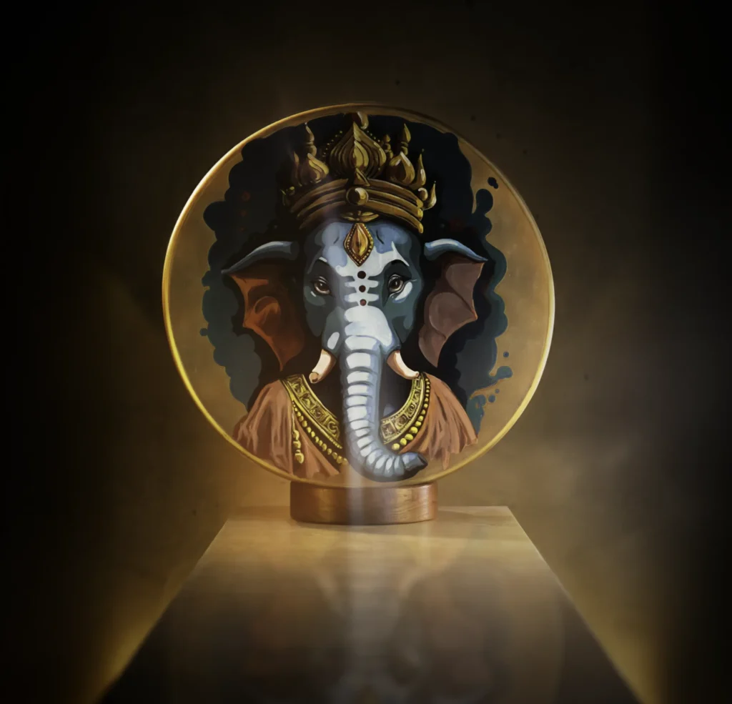 Ein einzigartiges Sammlerstück mit spiritueller Bemalung (z. B. Ganesha, Archetypen, Ahnen-Symbole).